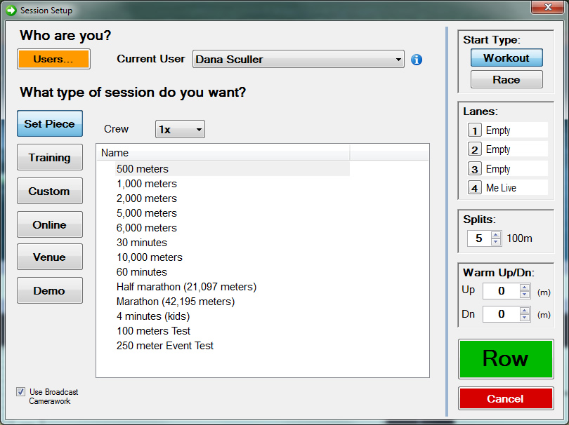 When you start RowPro, you just choose the row you want from a list, and click or tap Row. RowPro then sets up the row directly onto your Concept2 PM, and you can start rowing.